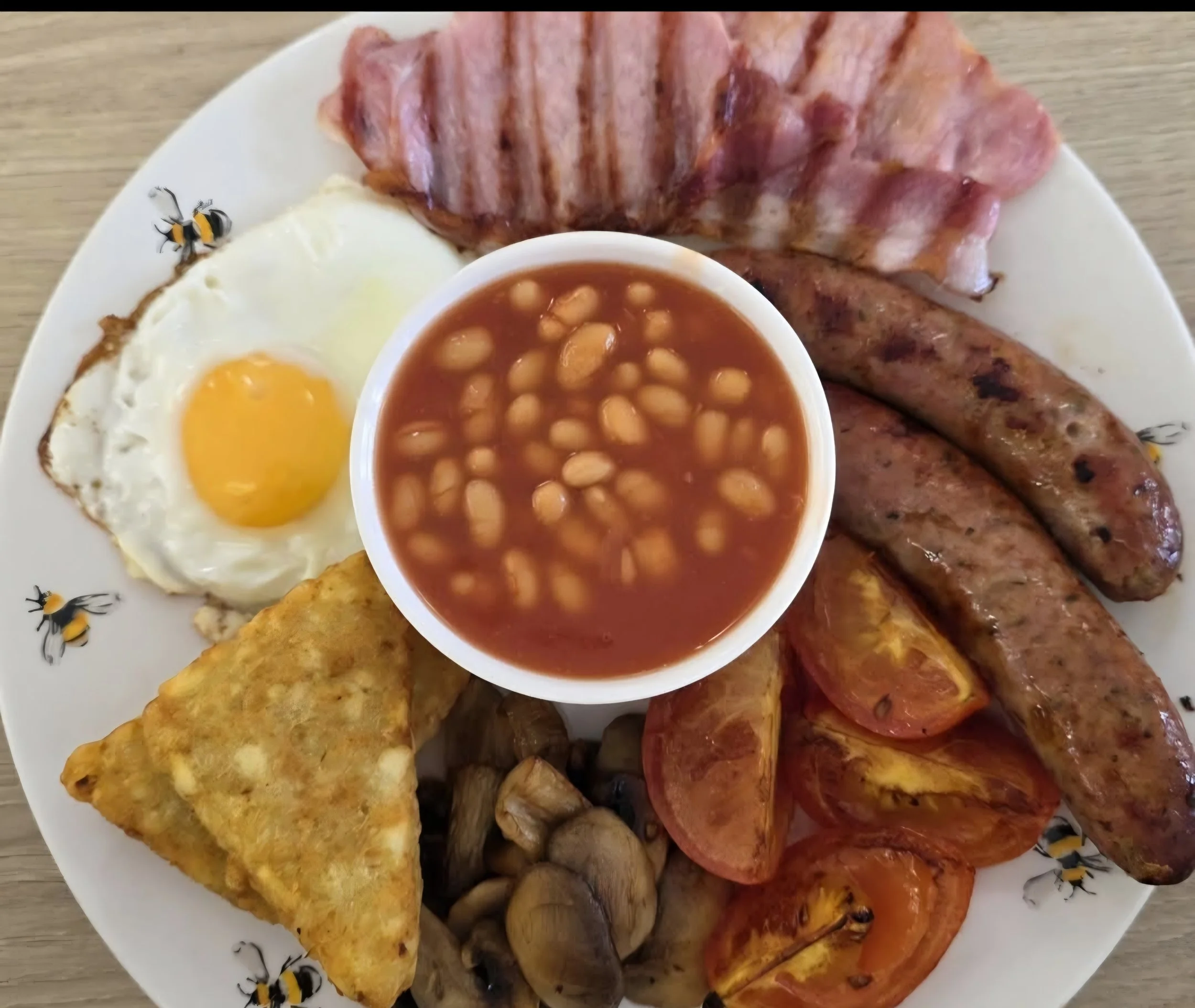 2x English sausages, 2x bacon slices, fried/scrambled eggs, 2x hash browns,tomatoes mushroom and beans and toast